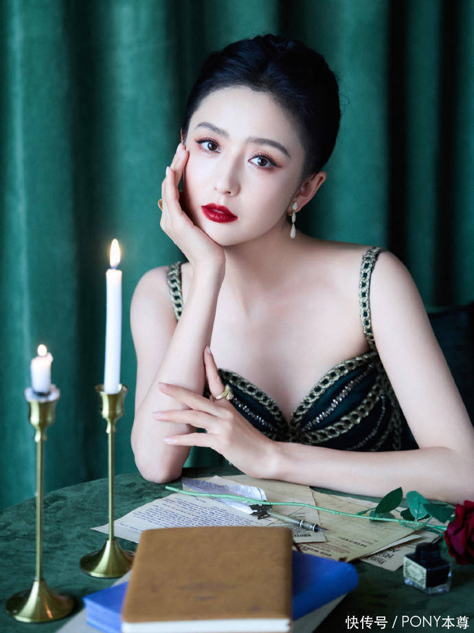 剧中的佟丽娅,身穿一袭墨绿色吊带长裙,搭配低扎盘发造型,又白又美!